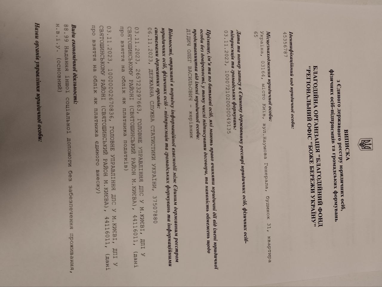 “БЛАГОДІЙНИЙ ФОНД “РЕГІОНАЛЬНИЙ ОФІС “БОЖЕ БЕРЕЖИ УКРАЇНИ”Код банку (МФО): - 320478Назва банку : - АБ “УКРГАЗБАНК”Номер рахунку - UA843000010000032000106201026Юридична Адреса: Україна, 03164, м. Київ, Святошинський район, вулиця Наумова генералаТел. +380631088951moc.liamg%401rkuevasdog